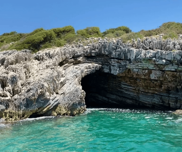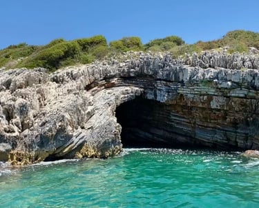 Pigeon Cave (Ksamil) is a small natural sea cave near Ksamil, known for its clear turquoise water and unique rock formations. It is a beautiful spot often visited by boats and swimmers exploring the coastline.